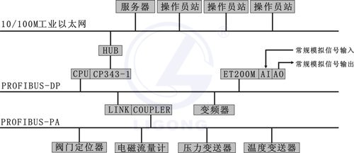 THFCS-1型現(xiàn)場(chǎng)總線過程控制系統(tǒng)從上位機(jī)控制系統(tǒng)到現(xiàn)場(chǎng)儀表之間清晰的分為三層,其中操作員站和服務(wù)器之間,服務(wù)器和主控制器之間采用工業(yè)以太網(wǎng)通訊,構(gòu)成了整個(gè)控制系統(tǒng)的管理級(jí);主控制器、遠(yuǎn)程分布式I/O模塊、變頻器、DP/PA耦合器之間通過PROFIBUS-DP協(xié)議進(jìn)行通信,構(gòu)成了控制系統(tǒng)的控制級(jí);控制級(jí)通過DP/PA鏈路延伸出下一級(jí)PROFIBUS-PA網(wǎng)絡(luò),壓力傳感器、電磁流量計(jì)、溫度變送器和閥門定位器直接掛接在同一條PROFIBUS-PA總線上,這樣就實(shí)現(xiàn)了現(xiàn)場(chǎng)儀表通過DP/PA鏈路和主控制器之間的數(shù)據(jù)交換。