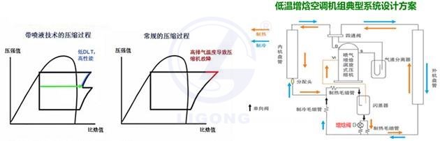 b、.補(bǔ)氣噴氣增焓功能,能確保-30強(qiáng)勁工作,普通空調(diào)通過增焓配件可達(dá)低溫室高效制熱功