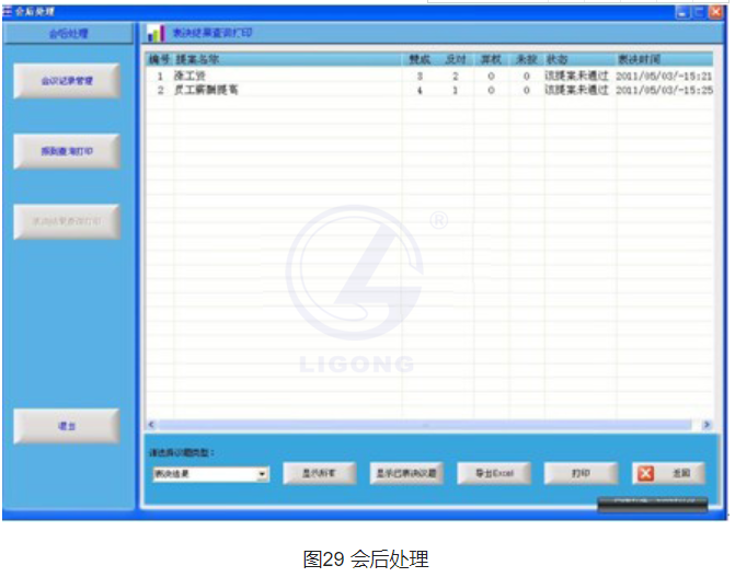 會(huì)議召開(kāi)完畢后,會(huì)議主辦方可對(duì)會(huì)議進(jìn)行總結(jié),包括會(huì)議記錄管理,報(bào)道查詢打印,表決結(jié)果查詢打印等,如圖29所示。