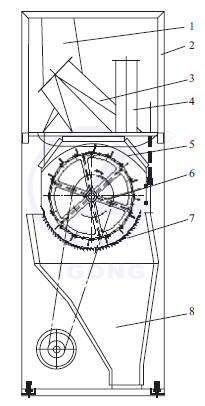 1—進(jìn)棉口 2—凝棉器機(jī)架 3—出棉口 4—排雜管 5—導(dǎo)流板 6—開(kāi)棉機(jī)打手 7—塵格 8—落雜箱