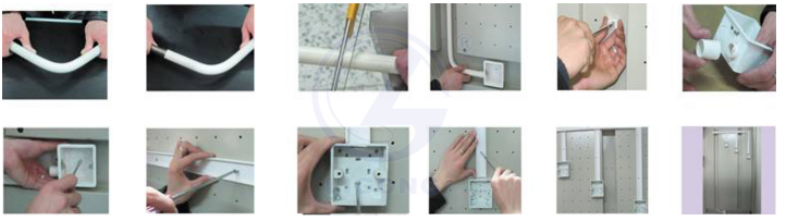 每座實訓單體墻有對稱的兩個墻面,每個墻面布有2道橫向和縱向凹槽,凹槽深度50mm,寬度100mm,下部橫向凹槽距離地面300mm。 鋼面板表面設有60X60毫米的安裝孔用來安裝各種線管、插座、線槽等,實訓過程只需要采用螺絲安裝保證無塵操作。模擬墻外部平整美觀,表面看不見墻體安裝螺絲或鉚釘。為保證產品絕對安全,不會產生傾覆的危險,綜合布線模擬墻*下層的安裝面板必須開孔與地面的地腳螺栓固定。