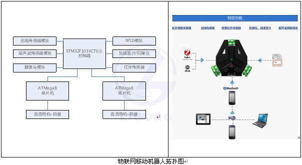 物聯(lián)網(wǎng)移動(dòng)機(jī)器人教研平臺(tái),是一款基于STM32方案推出的功能全面、性能卓越的物聯(lián)網(wǎng)智能移動(dòng)平臺(tái),能夠自主運(yùn)行、自主規(guī)劃,支持手機(jī)控制平臺(tái)運(yùn)動(dòng),集成了陀螺儀、巡線傳感器8路、6個(gè)紅外避障傳感器、超橫波測(cè)距模塊、RFID等多種傳感器,支持3G(智能手機(jī))、WiFi、Bluetooth和Zigbee無(wú)線網(wǎng)絡(luò)以及RFID等通信方式,是一款性能穩(wěn)定且功能強(qiáng)大的物聯(lián)網(wǎng)移動(dòng)平臺(tái)。
