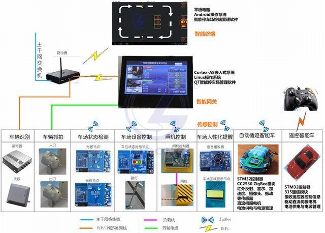 系統(tǒng)利用各種傳感器檢測停車場環(huán)境與車位占用狀況;結(jié)合嵌入式數(shù)據(jù)庫存儲(chǔ)技術(shù)將采樣數(shù)據(jù)統(tǒng)一保存管理;利用ZigBee無線傳感器網(wǎng)絡(luò)統(tǒng)一管理各個(gè)節(jié)點(diǎn);利用射頻技術(shù)實(shí)現(xiàn)車輛的自動(dòng)識(shí)別;利用圖像采集技術(shù)實(shí)現(xiàn)車輛抓拍;利用自動(dòng)控制理論和反饋控制理論實(shí)現(xiàn)智能控制;利用嵌入式Linux系統(tǒng)實(shí)現(xiàn)智能停車場管理軟件;利用WIFI網(wǎng)絡(luò)實(shí)現(xiàn)網(wǎng)關(guān)與服務(wù)器/客戶端之間的通信,激發(fā)用戶了解物聯(lián)網(wǎng)技術(shù)在城市停車場等現(xiàn)實(shí)環(huán)境的應(yīng)用。