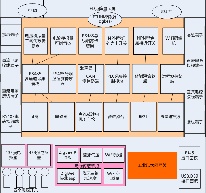 1、標配網(wǎng)孔操作板、四組直流供電板、四組有線傳感器的供電通信板、六個無線傳感器節(jié)點、一個工業(yè)以太網(wǎng)網(wǎng)關、兩個無線強電控制插座、四種交直流電源按鈕、指示燈、點陣顯示屏等,為行業(yè)創(chuàng)新應用提供硬件支持。