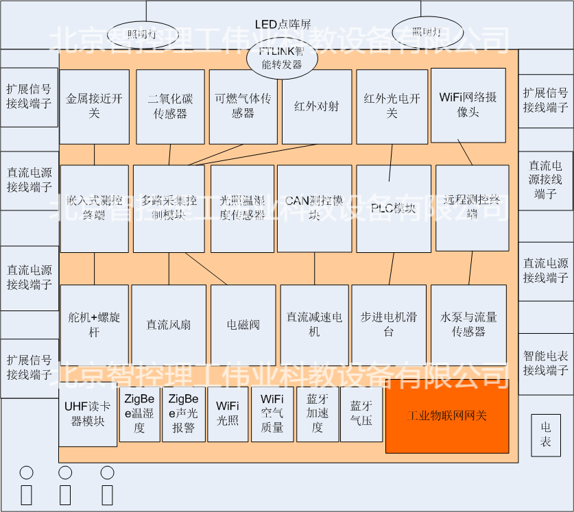 1、標配網(wǎng)孔操作板、四組直流供電板、四組有線傳感器的供電通信板、六個無線傳感器節(jié)點、一個工業(yè)物聯(lián)網(wǎng)網(wǎng)關(guān)、兩個無線強電控制插座、四種交直流電源按鈕、指示燈、點陣顯示屏等,為行業(yè)應用創(chuàng)新設(shè)計提供硬件支持。