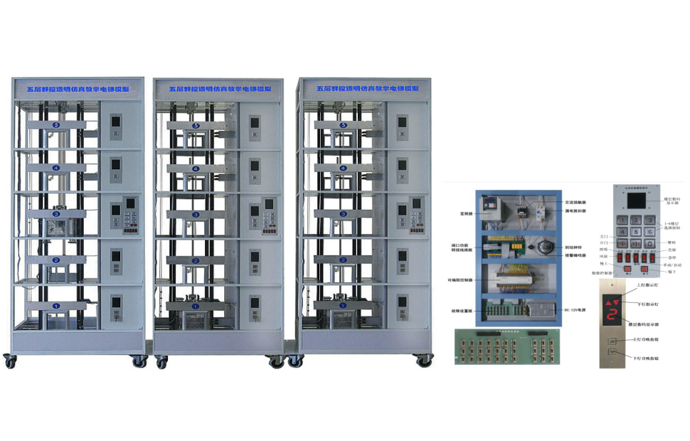 LG-DT05Q型 群控電梯實訓(xùn)考核設(shè)備采用交流變頻調(diào)速器與 PLC 通過開關(guān)量或數(shù)字量兩種模式進行控制,并且設(shè)置了常見的幾十項電路故障供學(xué)生實操。整套設(shè)備采用三臺五層群控電梯,每部電梯都由一臺 PLC 控制,PLC 之間通過 RS-485 串行通訊卡交換數(shù)據(jù),電梯外呼統(tǒng)一管理,接近現(xiàn)實中的樓宇電梯控制。通過它,學(xué)生不但可以提高故障的檢測和排除能力,還可以了解多臺 PLC 聯(lián)機編程原理從而提高編程技能。適用于大中專院校、技校、職業(yè)學(xué)?;螂娞輰I(yè)使用。