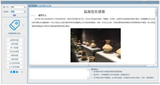 物聯(lián)網(wǎng)基礎(chǔ)技術(shù)原理教學(xué)平臺(tái)的軟件模塊,采用C#上位機(jī)教學(xué)資源軟件及聯(lián)動(dòng)場(chǎng)景案例,針對(duì)傳感器技術(shù)的教學(xué),每一個(gè)傳感器的原理、實(shí)驗(yàn)?zāi)康摹?shí)驗(yàn)原理、實(shí)驗(yàn)內(nèi)容、實(shí)驗(yàn)步驟、等實(shí)驗(yàn)指導(dǎo)書(shū)內(nèi)容移植到軟件模塊上,同時(shí)對(duì)實(shí)驗(yàn)過(guò)程、實(shí)驗(yàn)現(xiàn)象相對(duì)應(yīng)顯示出來(lái),實(shí)現(xiàn)了理實(shí)一體化教學(xué)的效果。并且可以在此軟件模塊上加載各系列硬件模塊套件的教學(xué)資源,包括實(shí)驗(yàn)場(chǎng)景引入,實(shí)驗(yàn)?zāi)康模R(shí)點(diǎn)掌握,實(shí)驗(yàn)步驟,關(guān)鍵代碼解析,實(shí)驗(yàn)現(xiàn)象及實(shí)驗(yàn)場(chǎng)景聯(lián)動(dòng)。能夠讓學(xué)生不僅學(xué)習(xí)傳感器概念、原理,并且可以在邊學(xué)原理邊練習(xí)操作和開(kāi)發(fā),生動(dòng)且有趣。軟件模塊的界面截圖如下圖所示: