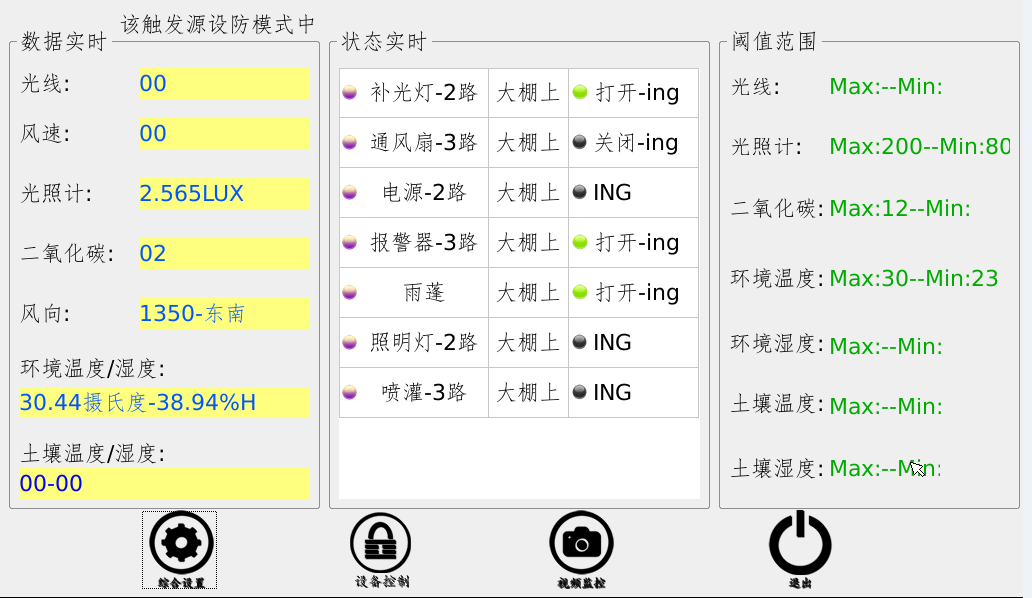 具有傳感器與執(zhí)行器的聯(lián)動設(shè)置功能。設(shè)置傳感器的上、下限值,以及當傳感器采樣低至下限或高至上限時,執(zhí)行器的動作,可實現(xiàn):(1)大棚內(nèi)溫度自動調(diào)節(jié)功能,(2)大棚濕度自動調(diào)節(jié)功能,(3)土壤濕度自動調(diào)節(jié)功能,(4)光照強度自動調(diào)節(jié),(5)大棚CO2濃度自動調(diào)節(jié)等功能。