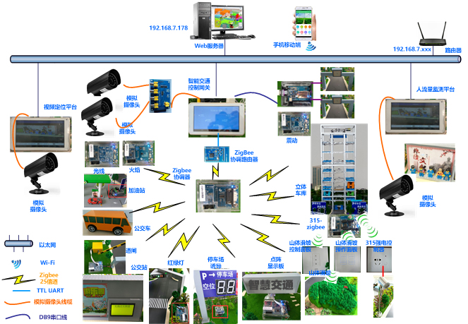 智能交通應(yīng)用實訓(xùn)系統(tǒng)以城市道路交通為原型,融合了無線傳感器網(wǎng)絡(luò)、RFID射頻識別、圖像識別、無線通信、云服務(wù)、M2M中間件等物聯(lián)網(wǎng)先進技術(shù),依托部署在交通沙盤中的智能車、紅綠燈、公交站、RFID設(shè)備、模擬攝像機、網(wǎng)絡(luò)攝像機、Android網(wǎng)關(guān)、圖像服務(wù)器等設(shè)備,實現(xiàn)智能車、紅綠燈控制、公交站自動播報、路燈控制、智能停車場、違章抓拍、車牌識別、人流量檢測、公路災(zāi)害智能預(yù)警等功能,為物聯(lián)網(wǎng)專業(yè)教學(xué)提供了一個完備的應(yīng)用實訓(xùn)系統(tǒng)。