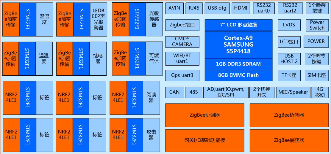 (2)物聯(lián)網(wǎng)網(wǎng)關≥1個:主芯片:采用S5P4418 Cortex-A9高性能處理器,可插接通訊模塊:ZigBee 2.4GHz,WIFI/BLuetooth二合一模塊、GPS定位模塊、4G移動通信模塊等。外設接口包括:以太網(wǎng)、串口、485、CAN、USB、USB otg、攝像頭、TF卡槽、模擬攝像頭TV、HDMI、按鍵等。