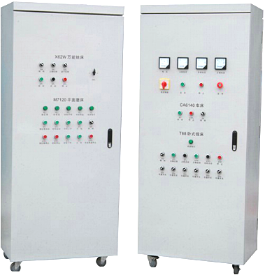 1.LG-JCG06型 機(jī)床電氣技能考核實(shí)驗(yàn)裝置采用標(biāo)準(zhǔn)配電柜為主體柜,充分利用該柜雙面空間位置,設(shè)有一臺(tái)銑床、一臺(tái)車床、一臺(tái)鏜床、一臺(tái)磨床,該配電柜將四種機(jī)床電氣線路合為一體,各種機(jī)床占地面積小,外形美觀;