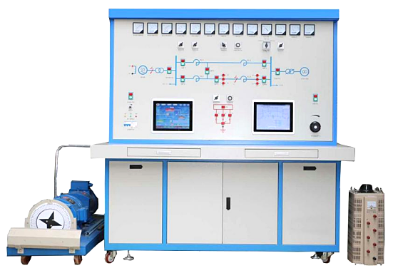 2、實(shí)驗(yàn)平臺(tái)由實(shí)驗(yàn)發(fā)電機(jī)組、發(fā)電機(jī)組控制柜、系統(tǒng)實(shí)驗(yàn)屏、無窮大系統(tǒng)、阻感性負(fù)載、監(jiān)控調(diào)度系統(tǒng)等組成。