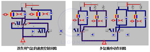 A、可完成40多種氣動(dòng)回路實(shí)驗(yàn)(學(xué)生也可自行設(shè)計(jì)搭建其它回路),典型實(shí)驗(yàn)如下