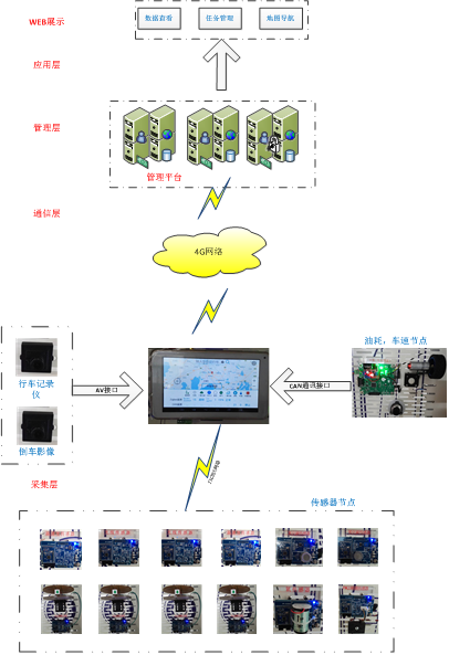 默認(rèn)運(yùn)行Android系統(tǒng),具有設(shè)備添加、ZigBee/CAN傳感器實(shí)時(shí)監(jiān)測(cè)、參數(shù)配置、行車(chē)記錄儀、倒車(chē)影像、地圖定位導(dǎo)航等功能項(xiàng)。系統(tǒng)設(shè)置主要設(shè)置CAN總線的波特率、zigbee協(xié)調(diào)器的串口號(hào)、服務(wù)器地址、傳感器上下限與執(zhí)行器的聯(lián)動(dòng)。設(shè)備添加主要用于向系統(tǒng)數(shù)據(jù)庫(kù)添加zigbee節(jié)點(diǎn)、CAN設(shè)備。行車(chē)記錄儀主要模擬車(chē)輛行駛過(guò)程中的視頻監(jiān)控。倒車(chē)影像主要模擬車(chē)輛在倒車(chē)時(shí)啟動(dòng)攝像頭進(jìn)行視頻監(jiān)控。系統(tǒng)支持導(dǎo)航定位,同時(shí)語(yǔ)音提醒道路狀況。當(dāng)?shù)缆钒l(fā)生擁堵時(shí),自動(dòng)發(fā)布。軟件內(nèi)置MQTT協(xié)議,可與WEB客戶端進(jìn)行即時(shí)通訊,實(shí)時(shí)顯示數(shù)據(jù)采樣信息和設(shè)備狀態(tài),同時(shí)通過(guò)webservice二次開(kāi)發(fā)接口將數(shù)據(jù)存入云服務(wù)器數(shù)據(jù)庫(kù),實(shí)現(xiàn)歷史數(shù)據(jù)存儲(chǔ)。