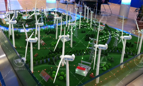 風(fēng)電場(chǎng)模擬動(dòng)態(tài)沙盤:大型風(fēng)電場(chǎng)布局比例設(shè)計(jì);模型整體布局為沙盤式,沙盤上布局20個(gè)小型風(fēng)力發(fā)電機(jī)模型,各風(fēng)機(jī)布局為錯(cuò)開式布置。風(fēng)機(jī)電動(dòng)演示,設(shè)置升壓站,輸電鐵塔、辦公樓等設(shè)施風(fēng)機(jī)、升壓站、輸電線路、場(chǎng)區(qū)環(huán)境,風(fēng)機(jī)電動(dòng)演示。