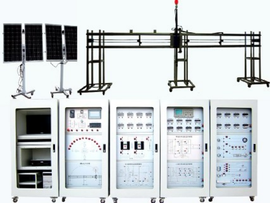 LG-TG01型 大型模擬太陽升降、太陽跟蹤、光伏發(fā)電、充電逆變實(shí)訓(xùn)裝置采用1000W節(jié)能燈模擬太陽,實(shí)驗(yàn)裝置可以模擬太陽的弧線升降全過程,而且模擬太陽的升降時(shí)間可以根據(jù)實(shí)驗(yàn)需要進(jìn)行更改。兩臺(tái)太陽跟蹤系統(tǒng)對(duì)模擬太陽的移動(dòng)進(jìn)行跟蹤,兩臺(tái)太陽跟蹤系統(tǒng)上的光伏發(fā)電裝置分別在模擬太陽下的進(jìn)行發(fā)電,并在充電控制系統(tǒng)的控制下向蓄電池充電,逆變系統(tǒng)對(duì)蓄電池的直流電進(jìn)行逆變,產(chǎn)生220V交流電,并給燈泡交流電機(jī)等負(fù)載供電。