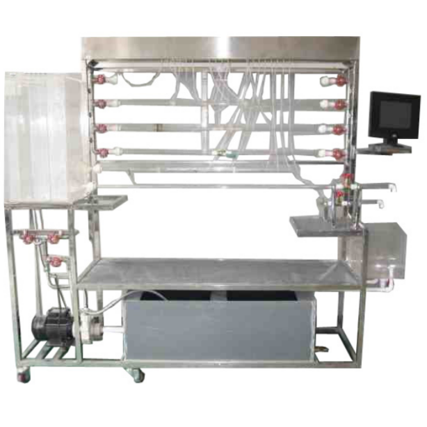 雷諾實驗管、伯努利實驗管、沿程阻力管、局部阻力管、水泵、秒表、玻璃溫度計、測壓計、刻度標(biāo)尺、文丘里流量計、實驗水箱、計量水箱、蓄水箱、指示液盒、壓力傳感器、流量傳感器、溫度傳感器、萬能信號輸入巡檢儀、軟件、不銹鋼框架、控制屏。