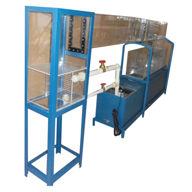 水泵、實驗水槽、蓄水箱、消能池、整流柵板、三角堰、寬頂堰、實用剖面堰、閘板、流量計、水位測針、量角器、刻度標(biāo)尺、水準(zhǔn)器、升降機(jī)、實驗管道、閥門、自循環(huán)裝置、不銹鋼框架及電控柜。