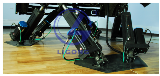 6自由度伺服電機控制電缸動感平臺,可實現(xiàn)前后、左右、上下三個方向的動態(tài)運動。伺服電動缸行程:200mm,前后傾角30º,左右傾角30º,水平轉(zhuǎn)角30º。承重:1000KG;總重250KG。采用高速六自由度反解算法,快速響應(yīng)飛機的動態(tài),達(dá)到與畫面完全同步的動態(tài)效果。